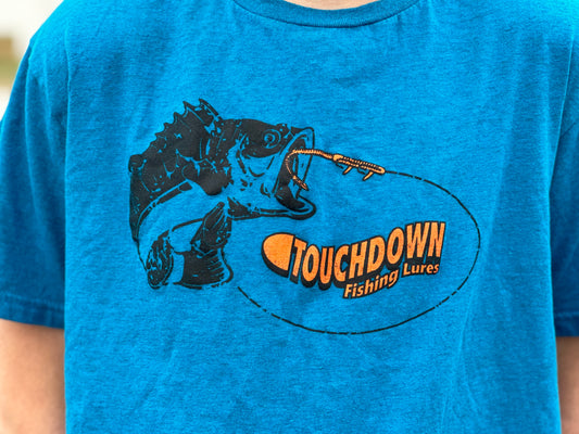 Short Sleeve Tee in Ultra Cotton Gildan T-shirt. Large Black and Bright Orange Touchdown logo on front of shirt. Now available in Graphite Heather (Gray), Antique Sapphire (Blue), and Caroline (Light) Blue in sizes from Youth-2XL.